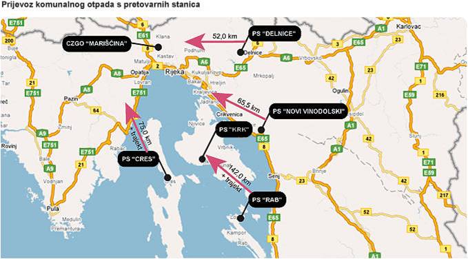 - izgradnjom pet pretovarnih stanica na prostorima sadašnjih odlagališta (Krk, Cres, Rab, Novi Vinodolski, Delnice) i njihovim transportnim povezivanjem sa ŽCGO.